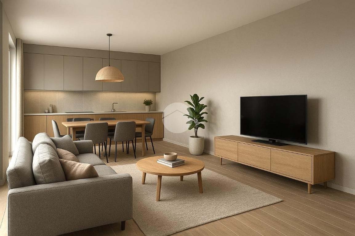 Ampia zona giorno openspace con soggiorno e cucina integrati, caratterizzata da grandi superfici vetrate che garantiscono luminosità e continuità tra interno ed esterno servita da bagno di servizio finestrato.